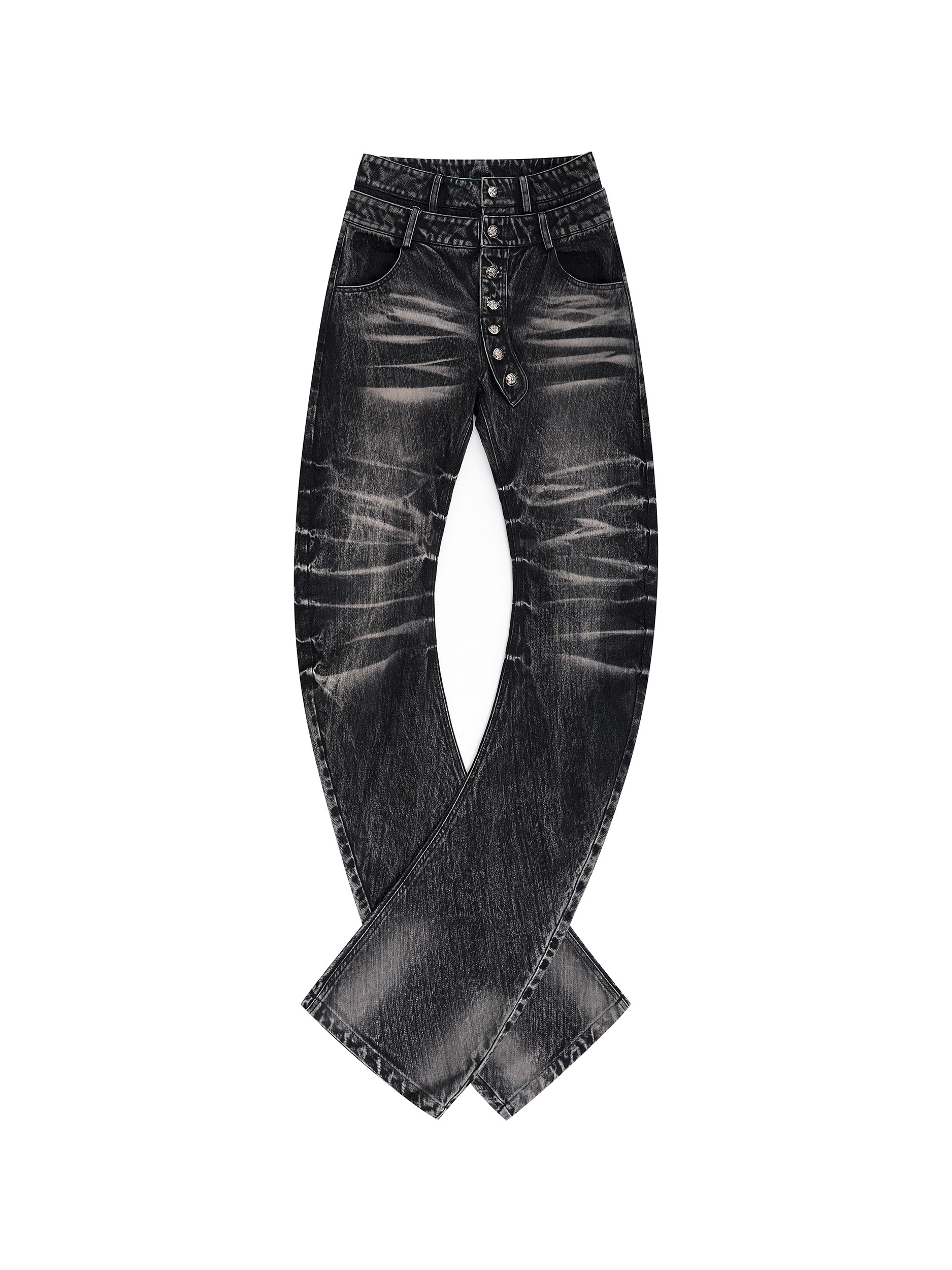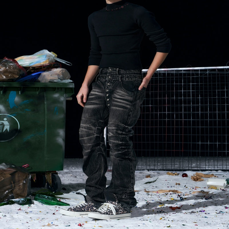 Bamboo-Stripe Double-Waist Metal Button Cat-Foot Denim Jeans